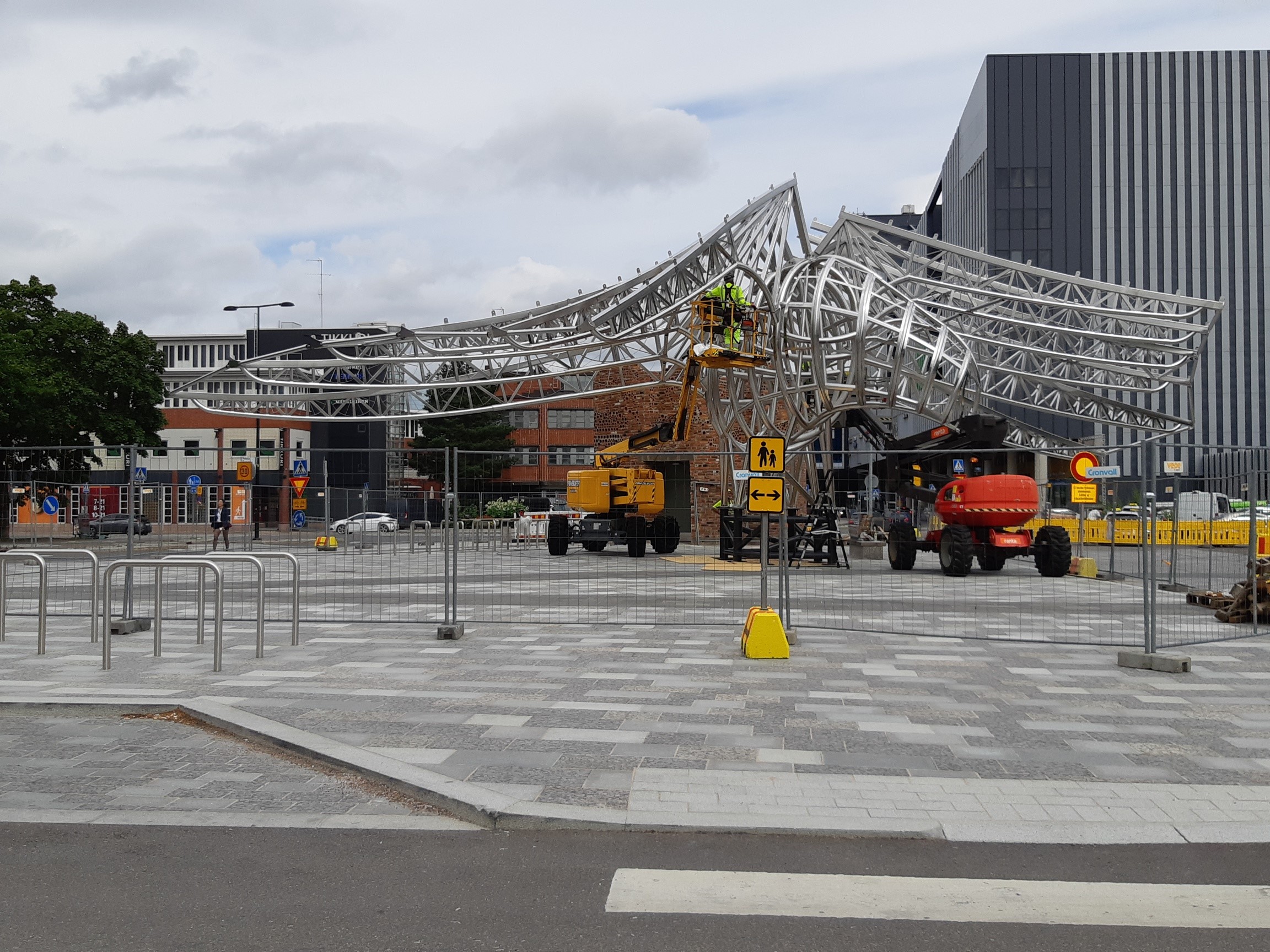 Tikkurilan aseman tuntumassa oleva Carl Albert Edelfeltin aukio alkaa valmistua. Valmistumista viivästytti aluetta urakoineen yrityksen konkurssi. Alueen katseenvangitsijaksi tulevaa valtavaa Korppi veistosta valmistellaan aukiolla. Korppi nostetaan jo aukiolla olevan kierrätystiilistä muuratun jalustan päälle. Korppi veistoksen ovat toteuttaneet taiteijapariskunta Teija ja Pekka Isorättyä. Teos ei ole pelkästään katsottavaksi, vaan Korpin valtavat siivet tuovat myös suojaa sateelta…