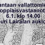 Vantaan Vallattomat, tällä kertaa kokoonpanossa: Vantaan Köyhät ryhmä, Kriittinen ay-verkosto, VAHTI ry, Vaihtoehto EU:lle Vantaan toimintaryhmä, kutsui kansaa Lauri Lairalan aukiolle viettämään Loppiaista. Tilaisuus järjestettiin kiinnittämään vantaalaisten huomiota kaupungin taloudenpitoon. Kaupunkihan järjesti oman vastaanottonsa lähes samanaikaisesti. Kaupungin tilaisuuden kuluihin oli varattu 78 000 eur. Määrärahastahan äänestettiin vuoden 2013 budjetin hyväksymisen yhteydessä. Vihreät, vasemmistoliitto ja osa…