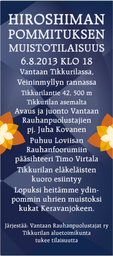 Hiroshima – ei koskaan enää by erkki • 5 elokuun, 2013 Hiroshiman pommituksen vuosipäivänä 6.8. klo 18 Hiroshiman pommituksen uhrien muistotilaisuus Veinin myllyllä Tikkurilassa.