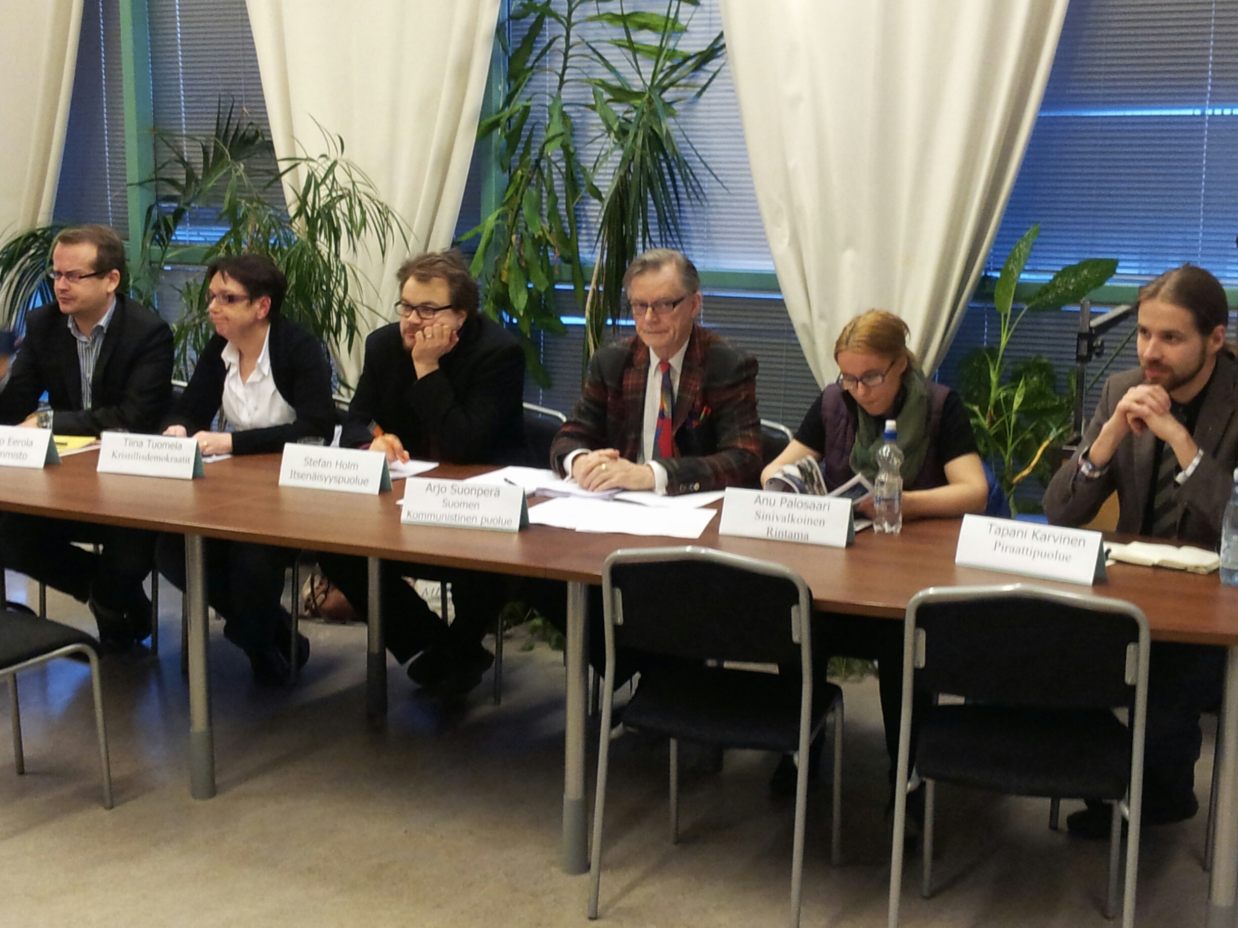 Eurovaalifoorumin puolustus- jaturvallisuuspolitiikan tilaisuuden 5.3. panelistit vasemmalta Antero Eerola (vas), Tiina Tuomela (KD), Stefan Holm (IPU), Arjo Suonperä (SKP), Anu Palosaari (Sinivalkoinen Rintama), Tapani Karvinen (Piraattipuolue)