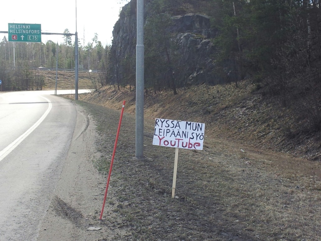 Hakunilassa Kehä III:n Helsinkiin johtavalla rampilla on liikennemerkkien seuraksi pystytetty mainostaulu: Ryssä mun leipääni syö.
