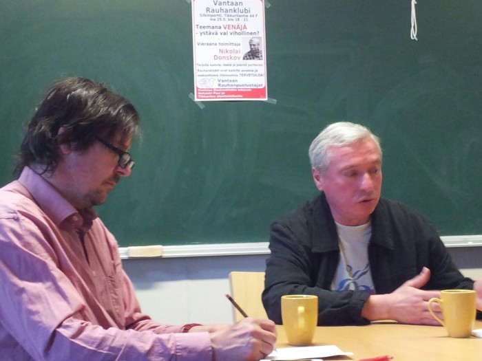 Vantaan Rauhanpuolustajat järjesti maanantaina kevätkauden päättäjäisten kunniaksi mielenkiintoisen tilaisuuden. Vantaan Rauhanpuolustajat sai vieraakseen Novaja Gazetan toimittajan, Nikolai Donskovin, joka oli saapunut Suomeen Pietarista. Teemana oli ”Venäjä – ystävä vai vihollinen?” Tilaisuus oli luonteeltaan keskustelunomaista. Paikallaolijat saivat toisin sanoen kysyä kutsuvieraalta kysymyksiä esimerkiksi Venäjän nykypolitiikasta, Venäjän näkökulmasta liittyen kansainväliseen tilanteeseen ja Venäjän ja Suomen välisistä suhteista. Tilaisuudessa oli myös mukana tulkki, joka tulkkasi Donskovin vastauksia englannista suomeksi. Mainittakoon sekin vielä, että kommentit olivat pääasiassa Donskovin omia näkemyksiä – joku muu olisi saattanut nähdä asiat toisella tavalla.