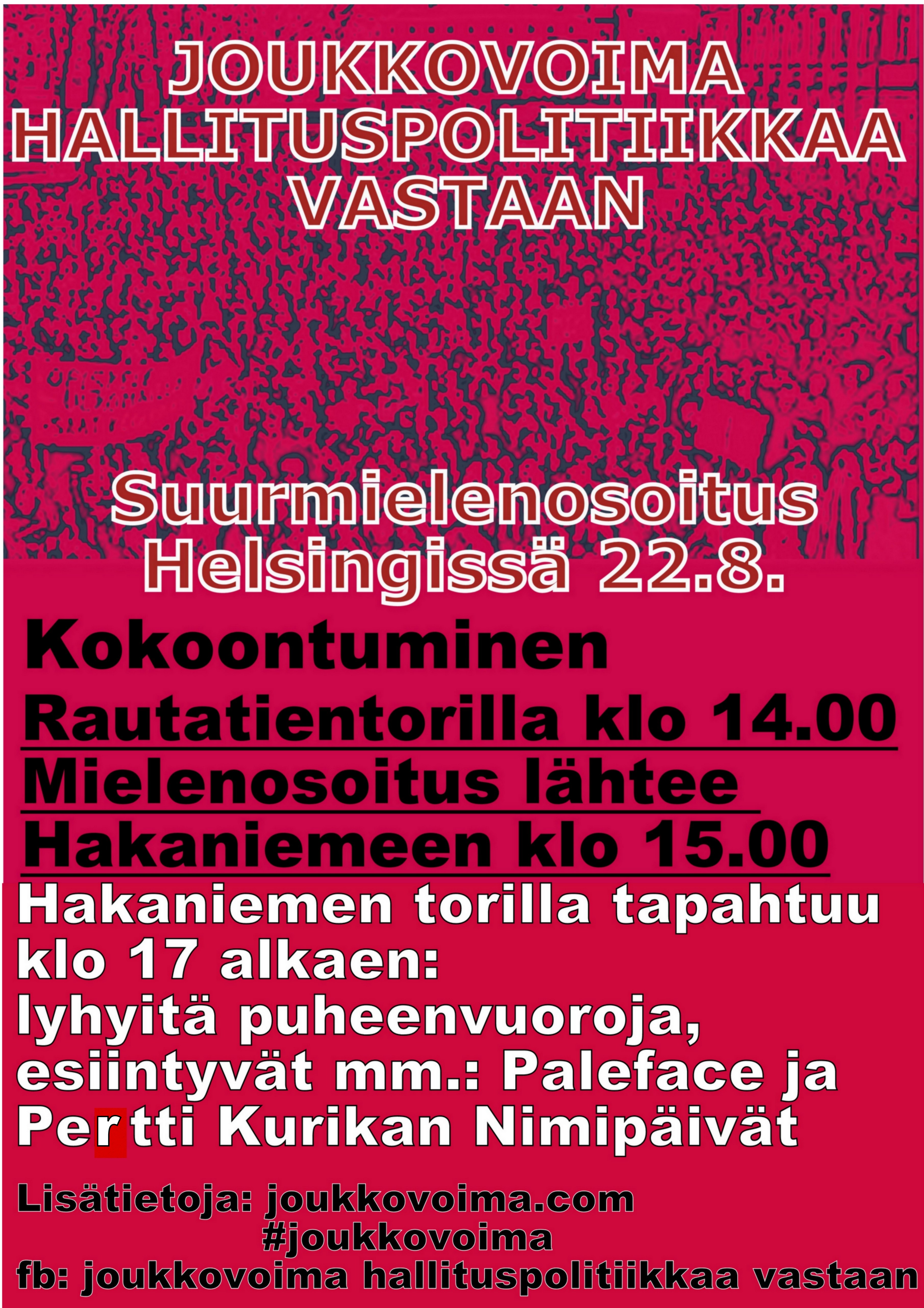 Kaikki Helsingin Rautatientorille lauantaina 22.8. klo 14.00.