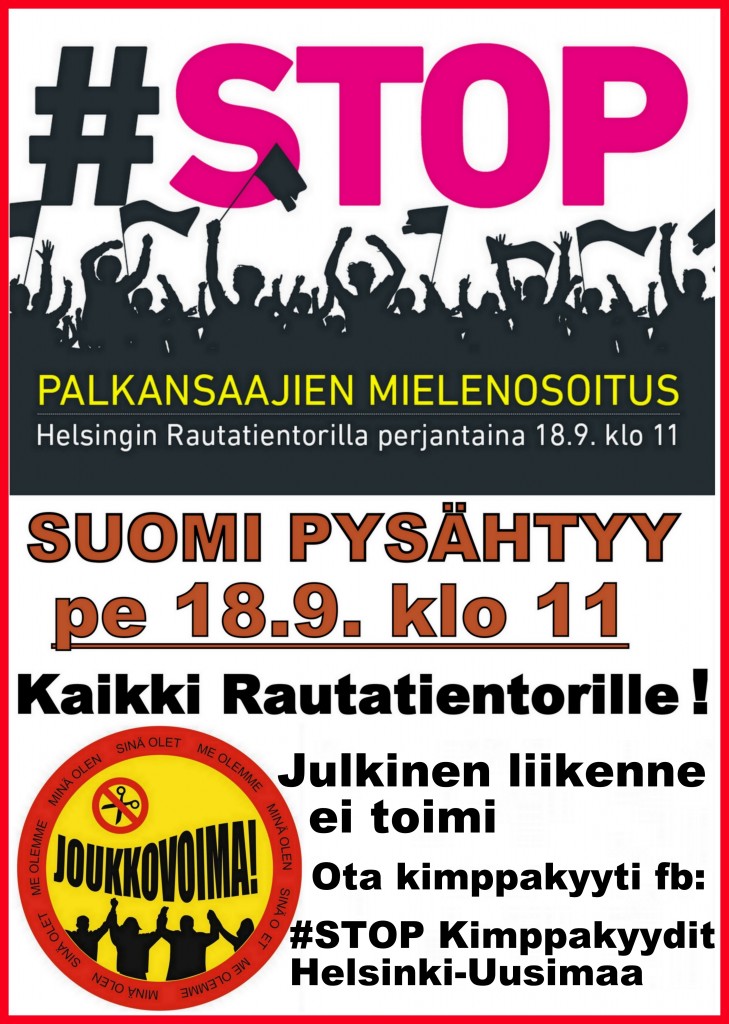 Suurmielenosoitus hallituksen leikkauspolitiikkaa vastaan by AsukkaidenVantaa • 14 syyskuun, 2015 SAK, Akava ja STTK järjestävät yhdessä mielenilmauksen työn, sopimusoikeuden ja järjestymisvapauden puolesta, hallituksen pakkotoimia vastaan.