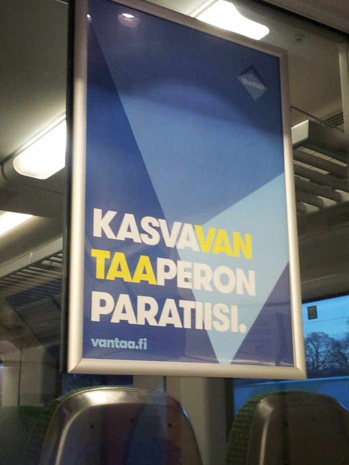 Vantaalla on käynnissä parhaillaan jonkinlainen Vantaa imagokampanja. Ainakin yhtenä osana on lähijunissa totetettava julistekampanja.