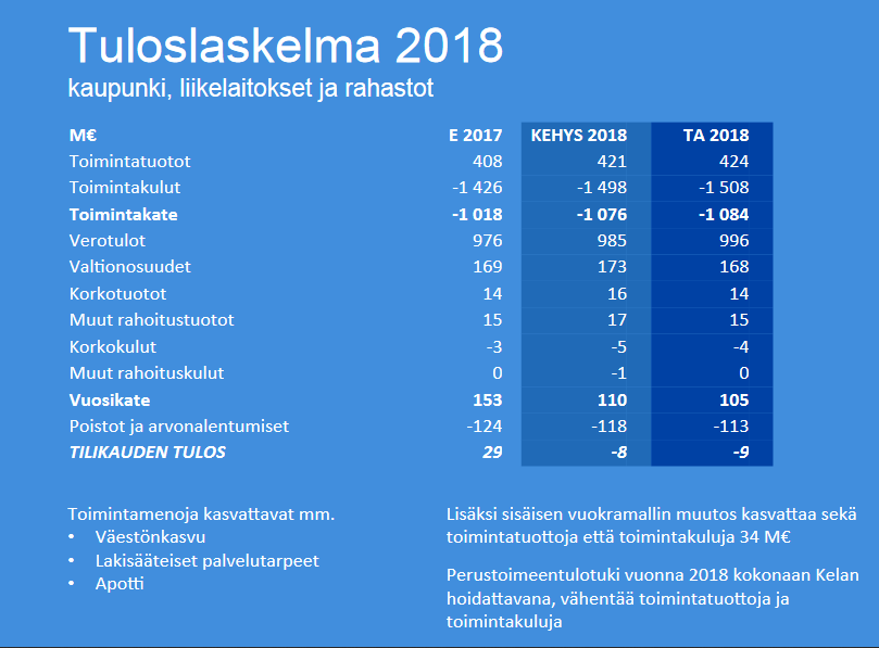 Veroprosentti pidetään entisellään 19,0 %. Talousarvion kokonaissumma on n. 1,5 mrd joista veroilla katetaan 985 milj. toimintatuottoja on runsaat 400 milj. ja valtionosuuksia 173 milj.