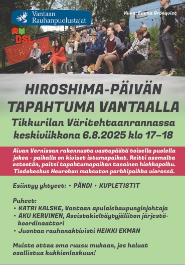 Vantaan Rauhanpuolustajat järjestää Hiroshiman atomipommin uhrien muistolle tilaisuuden 6.8. klo 17.00-18.00. Tilaisuus on Väritehtaan rannassa Tikkurilassa.