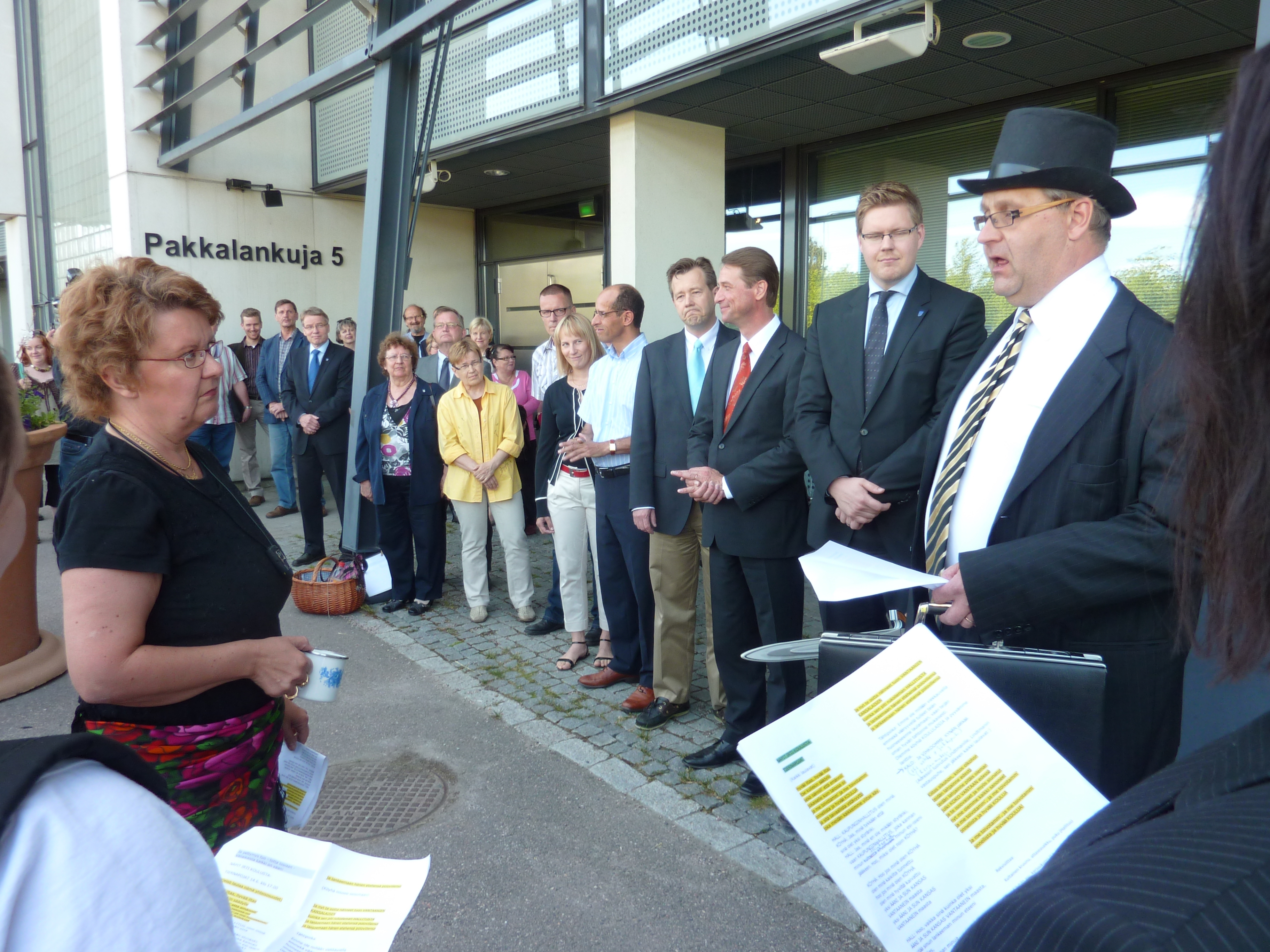 Näpit irti koulusta-liikkeen mielenilmaus 14.6. Leijan pihamaalla Pakkalassa Vantaan valtuuston valmistelukokouksen yhteydessä jätti adressin ja terveisensä vantaalaisille valtuutetuille.